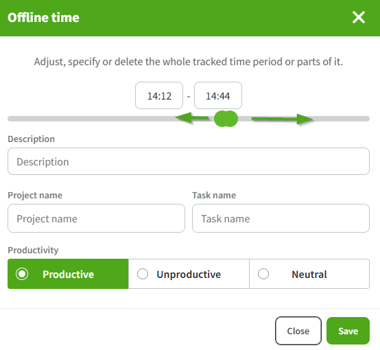 After you have entered the description, mark whether the offline time was productive, neutral or unproductive. It is also possible to assign offline time to a specific project and define its productivity. Once saved, the offline time will appear in your Productivity bar.
