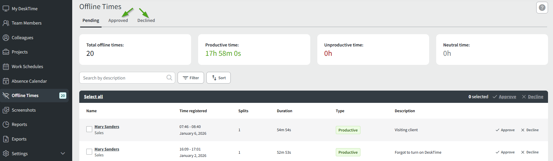 All users' Offline times will be delivered to this section and will remain pending until one of the admins or the owner approves/declines the offline time. There will be information given about the pending offline time: