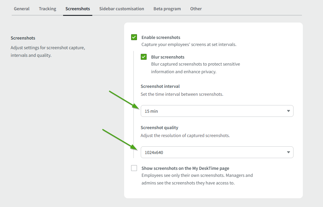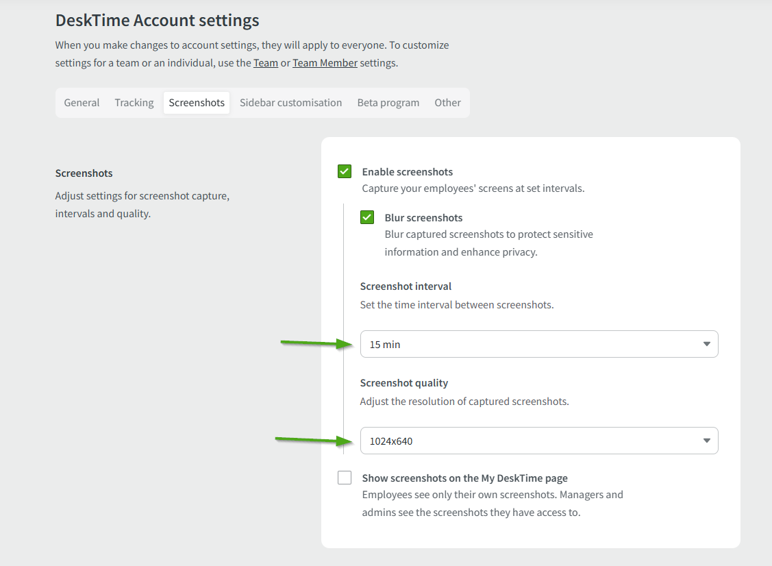 Intervals and quality can be changed for the whole account, a team, or for each user individually. To change them, look for the Screenshots section in settings. (Settings → Account → Screenshots.)