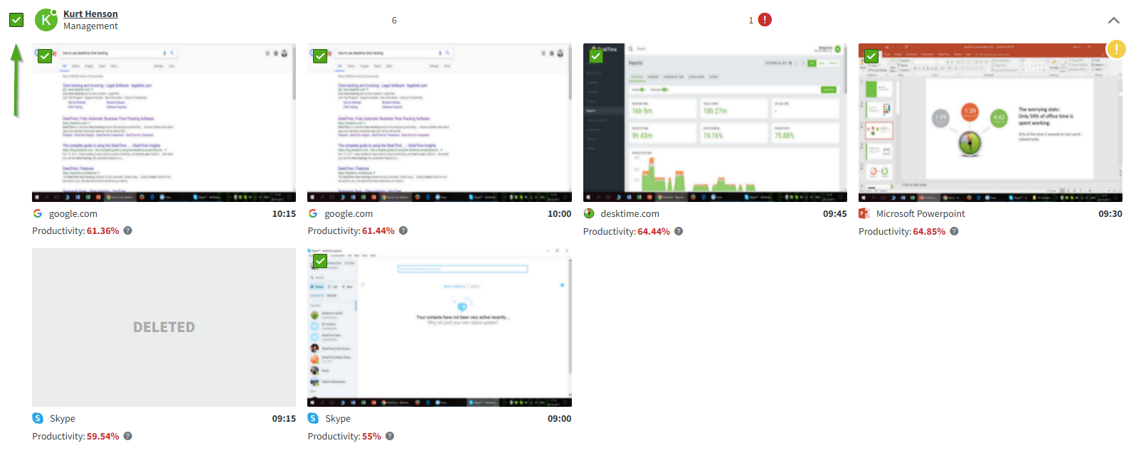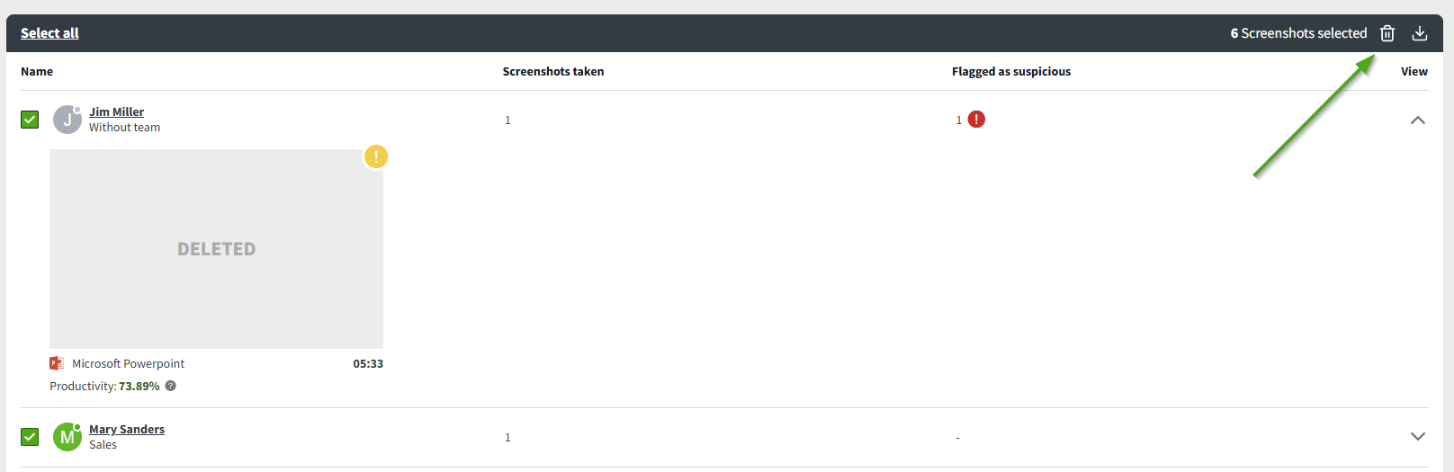 You can select specific images to be deleted or use the Select All option in the My DeskTime and Screenshots sections.