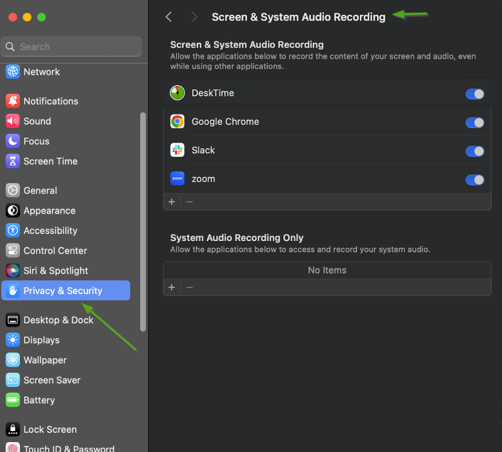 - Scroll down until you see the option Screen & System audio recording;