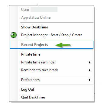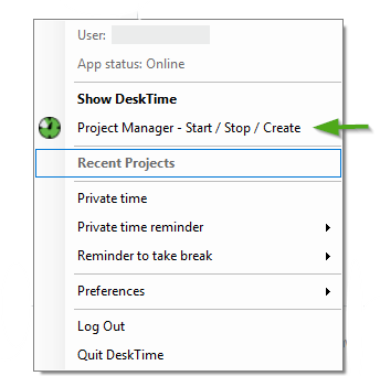 To start tracking a project, right-click on the DeskTime icon on your desktop's taskbar and select ''Project Manager - Start/Stop/Create''. There you can find already existing projects, or create new ones, as well.