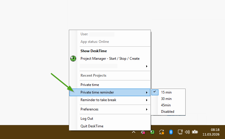 Right-click on the DeskTime app icon in your taskbar (system tray).