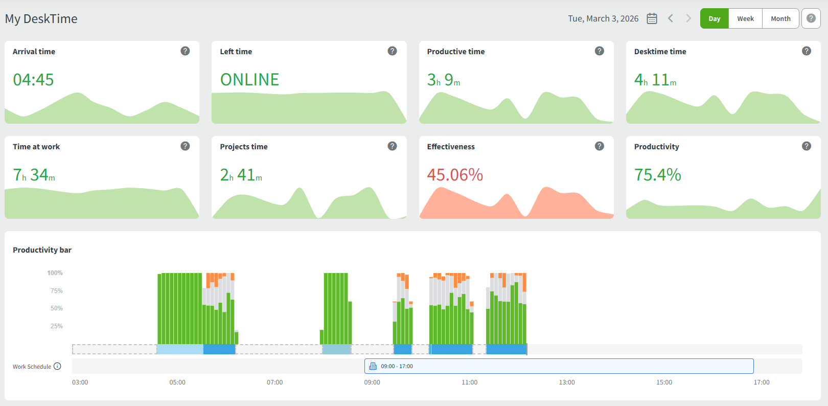 The My DeskTime page is your personalized dashboard. It is the first page you see upon login and serves as the primary hub for monitoring your daily, weekly, or monthly statistics.