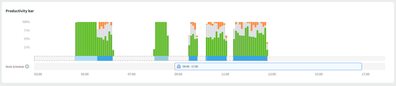 A visual timeline of your day divided into 5-minute segments. It is color-coded (green/gray/orange) by productivity level and displays specific apps, URLs, manual time, Private/Deleted time, and Idle periods.