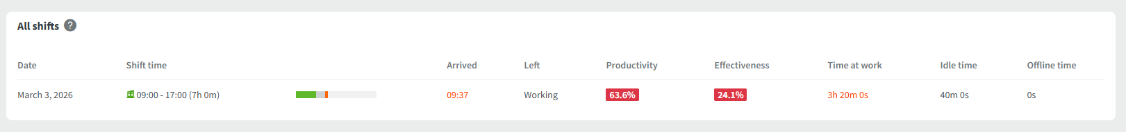 A detailed breakdown of your Work Schedule. This includes your assigned shift times vs. your actual Arrival/Left times, total time at work, and your productivity metrics specifically during those shift hours.