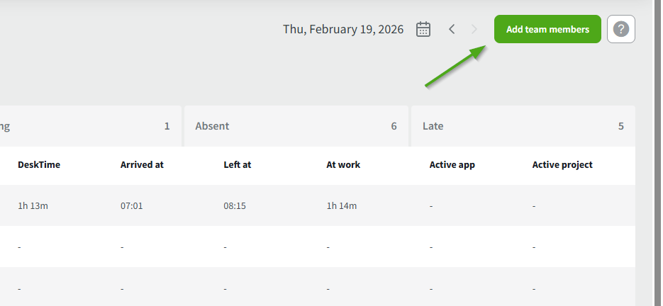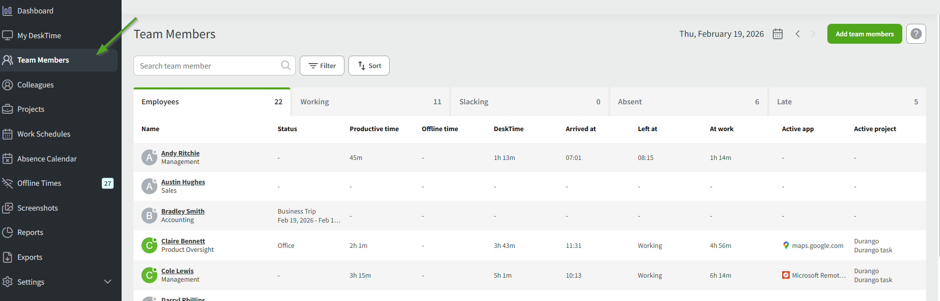 The Team Members section provides real-time insights into your team’s activity. It is accessible for all user roles except employees.
