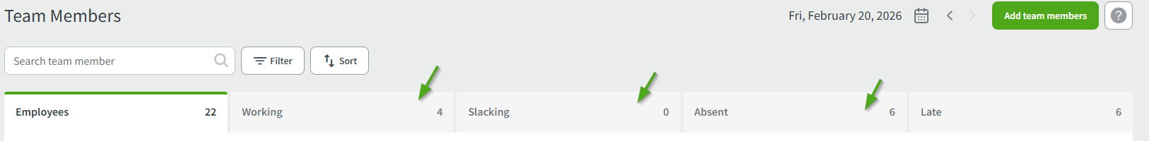 Status tabs: Click the category tabs to quickly see who is currently Working, Slacking, Late, or Absent.