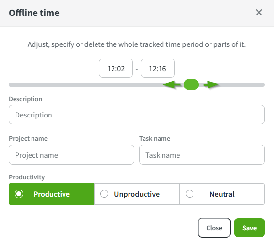 When needed, you can manually add Offline time directly from your Productivity bar in your My DeskTime section, with an explanatory description and projects, if necessary.
