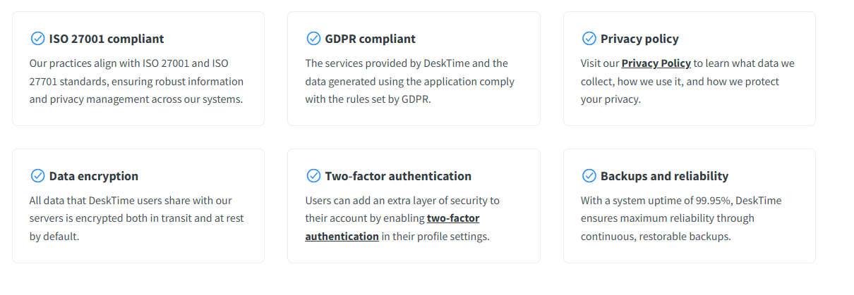 Desktime is also ISO 27001 and ISO 27710 certified.