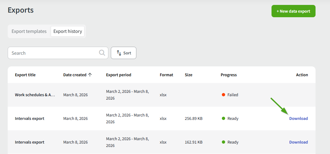 If the export contains a large amount of data, it might take some time to prepare. Once it is ready, click Download to save the file.