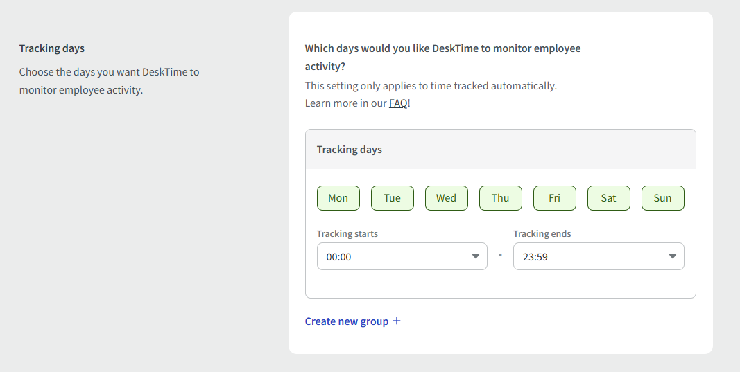 In the Tracking days section, you can mark what days and times DeskTime will track details from your employees. By default, Saturdays and Sundays will not be enabled, so turn those on if your employees may work on weekends.