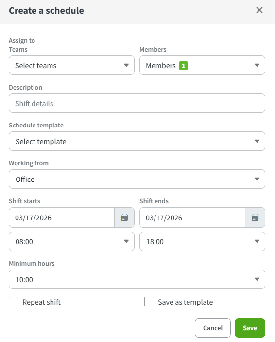 To assign a shift to an employee, press the Add schedule button. This will open the shift creation menu: