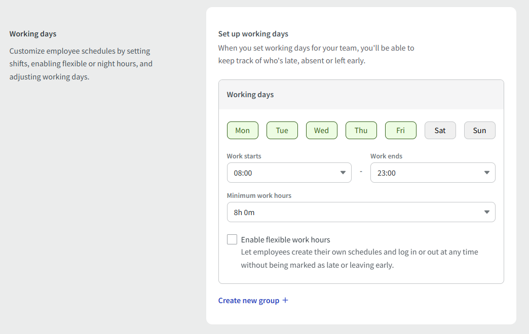 In the Work schedules section, you can assign specific working hours for your employees in the form of shifts. With this feature, you can assign night shifts and multiple shifts a day, as well as specify if your employee is going to work from home or in the office.