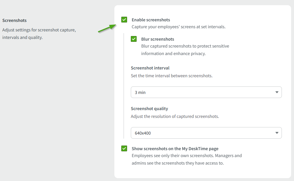 To use the Screenshots feature, you will need to Enable screenshots in settings. Here you can also choose to blur the screenshots and set the time interval between them. Taken images will be visible in the Screenshots section by Company Administrators.