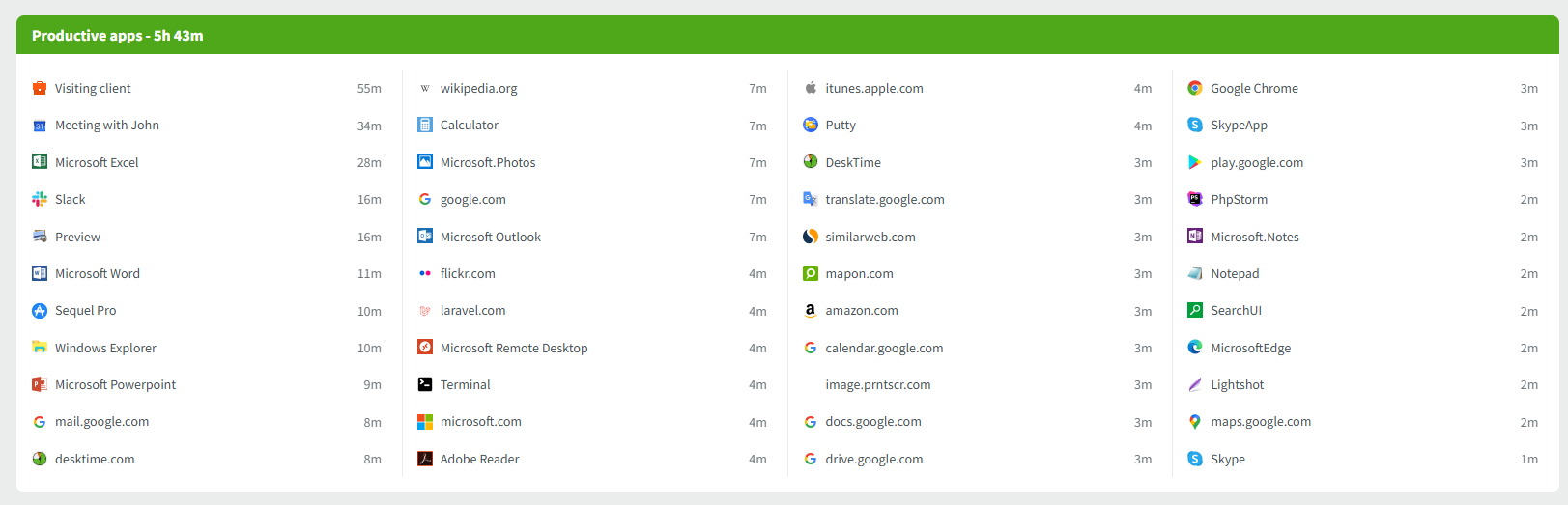 Most importantly, you can see what application each employee is working on and what project they are tracking if any. The list will refresh automatically (Usually within each minute. Summaries can take up to 30 minutes to refresh), so you can always know what is going on for the day.