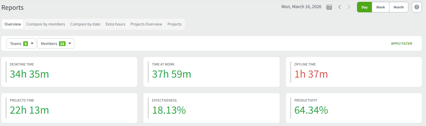 At the top right side, you can change the time period for the data to a week or a month and navigate to different periods with the arrow buttons. The Teams and Members lists will allow you to filter out specific employees or teams to be shown in the reports.