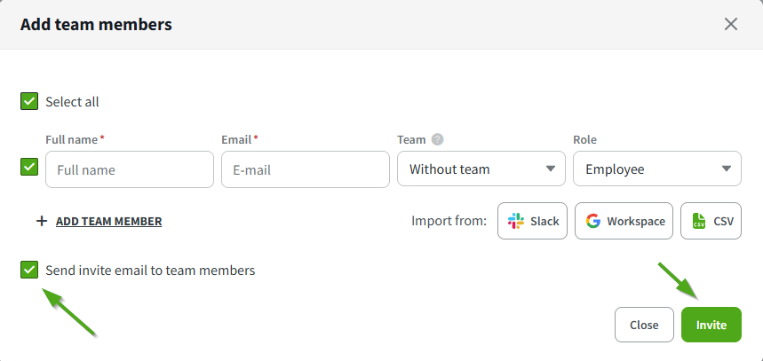 Regardless of the path you choose, a pop-up window will appear. Fill in the required details for your new team member. At the bottom of the window, you can choose whether to send an invitation email immediately by checking the invitation box.