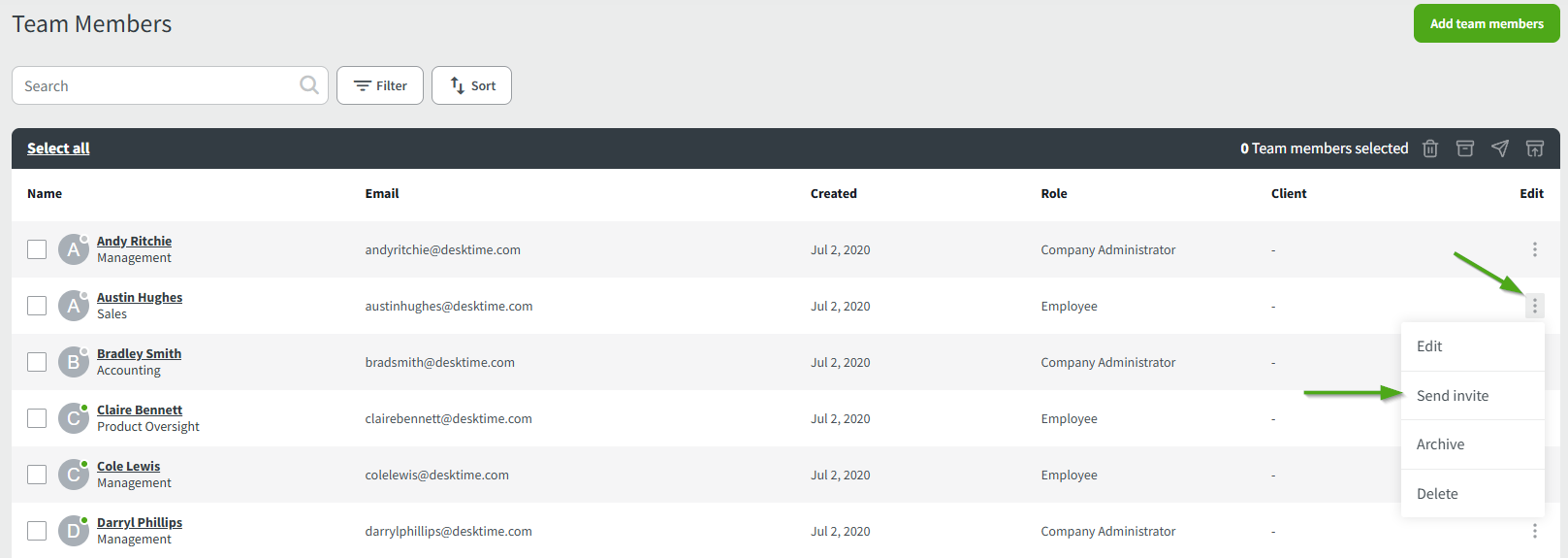 Option 1: Navigate to the Team Members section and click the green Add team members button in the top-right corner.