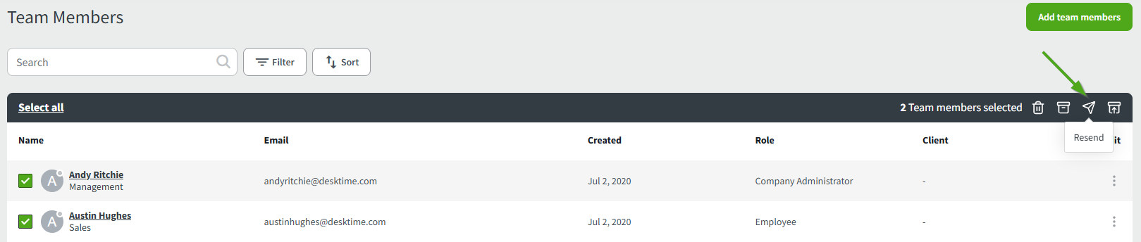 Bulk Resend: You can also resend invitations by checking the box next to a member's name and clicking the paper plane icon.