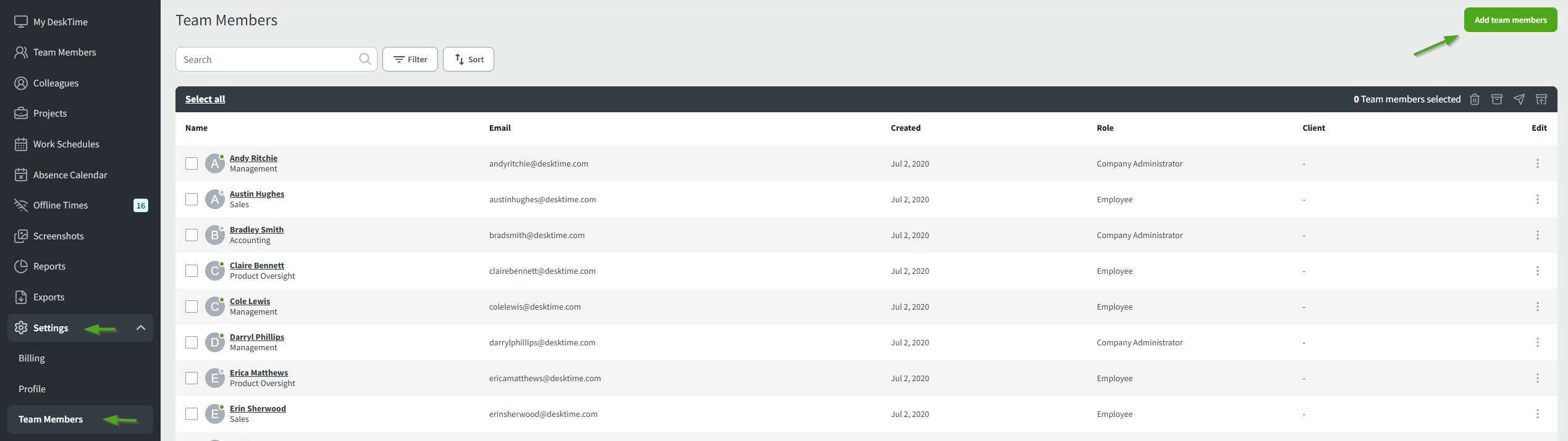 You can add other employees to your DeskTime account to track their time and actions throughout the day. The company owner and admins can see an overview of their employees in the 'Dashboard' section.