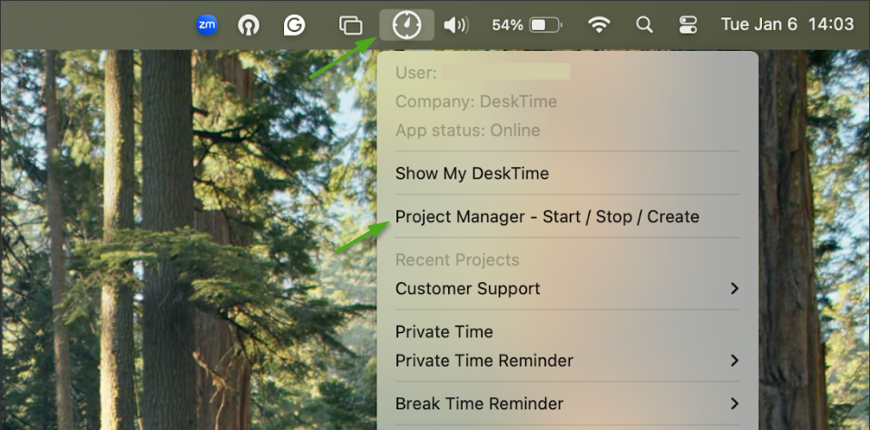To use the project timer, you need to right-click the DeskTime icon in the taskbar -> click on Project Manager-Start / Stop / Create.