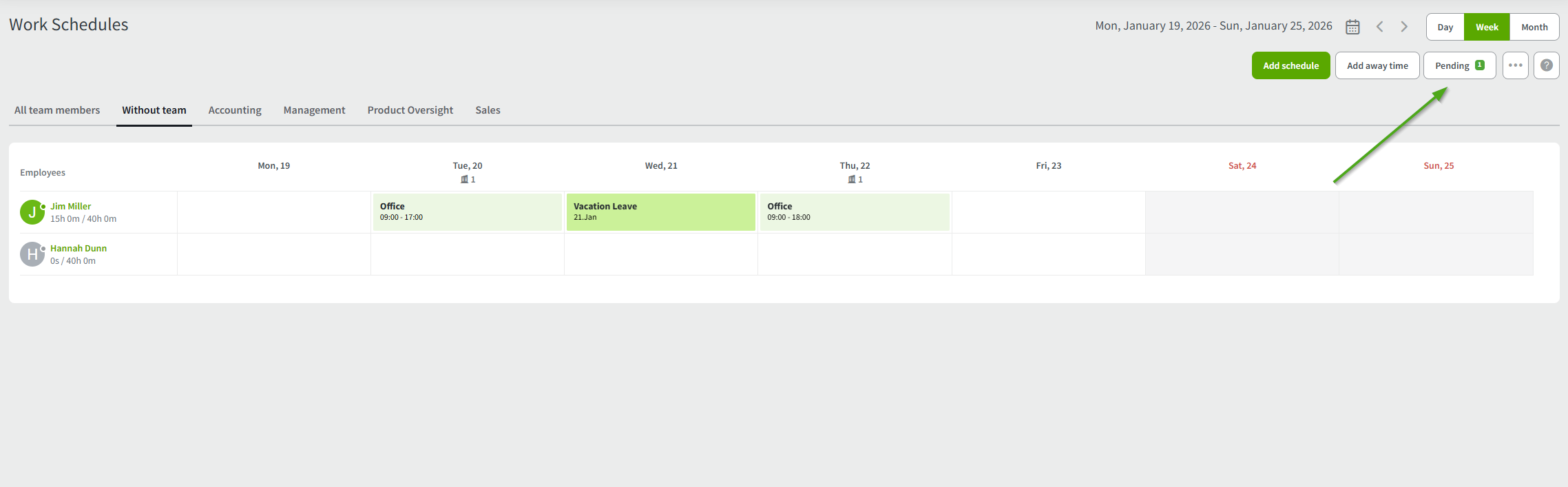 Only the Company owner and admins can see the pending tab. Clicking the button will open the Review Schedules page to approve or decline the shift request.