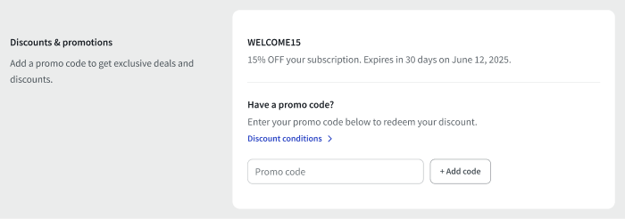 1. Go to Settings > Billing >Subscription overview. Then go to the Discounts & promotions section.