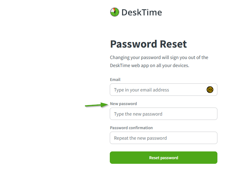 Please note that after performing a password reset, you will be automatically logged out of DeskTime web, desktop, and mobile applications! Your time is tracked only if you are logged into the DeskTime desktop app so we advise logging back in at your earliest convenience.