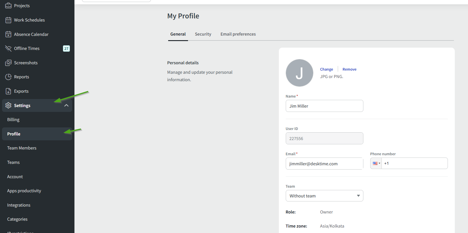 Alternatively, Company Owners can go to Settings -> Account -> General to edit personal details regarding the whole DeskTime account.