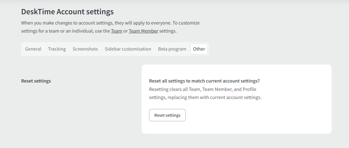 3. Click the Reset settings button in Account settings, and all DeskTime account users will be aligned to the account settings. This clears all Team, Team Member, and Profile settings, replacing them with current account settings.