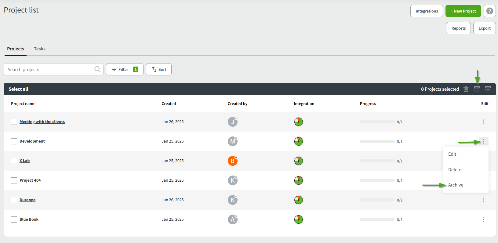 To archive a project, use the Archive button. Archiving a Project lets you set it aside and come back to it later.