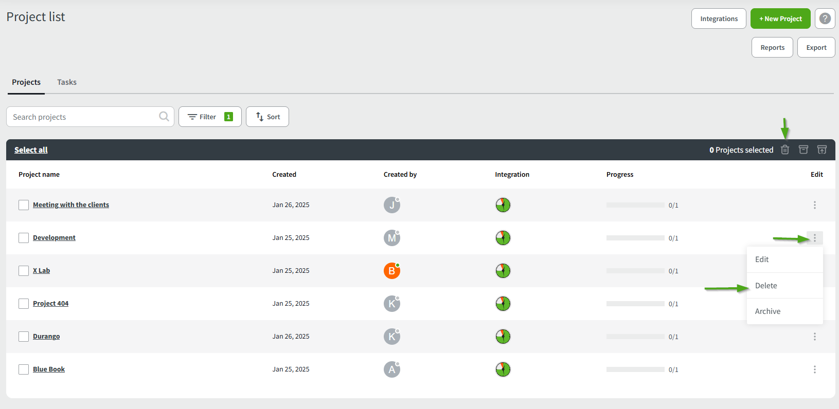 - Select the project or projects you want to delete and click on the trashcan icon above.