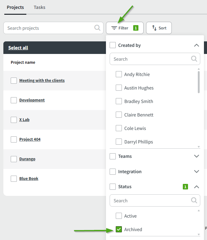 Archived projects will no longer be shown in the Projects section unless you look them up through a filter. To view Archived projects, click on the filter button, opt for sorting by status, and select Archived. Once done, click Apply.