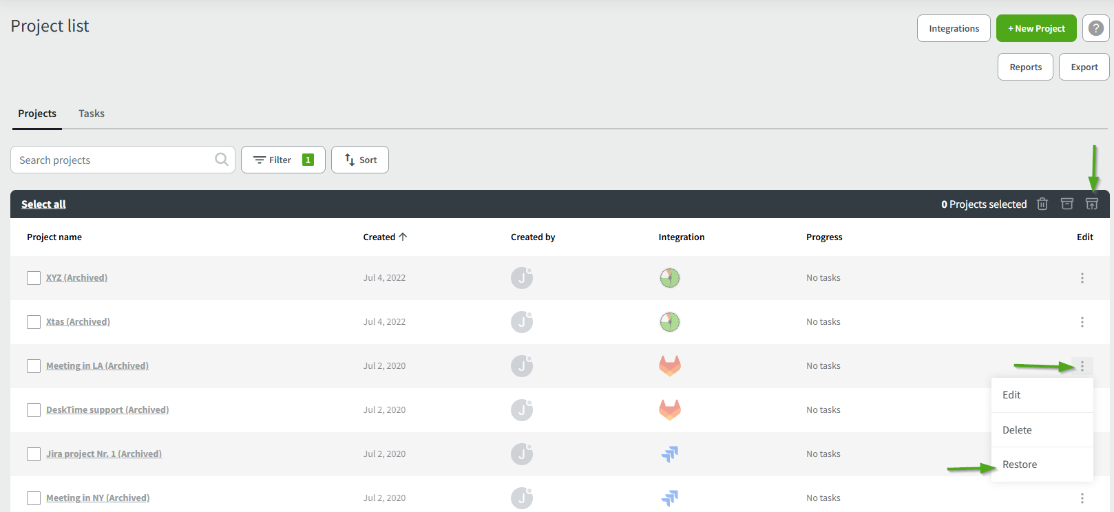 Now you will see the list of all projects that have been archived and, if needed, restore them by using the Restore button.