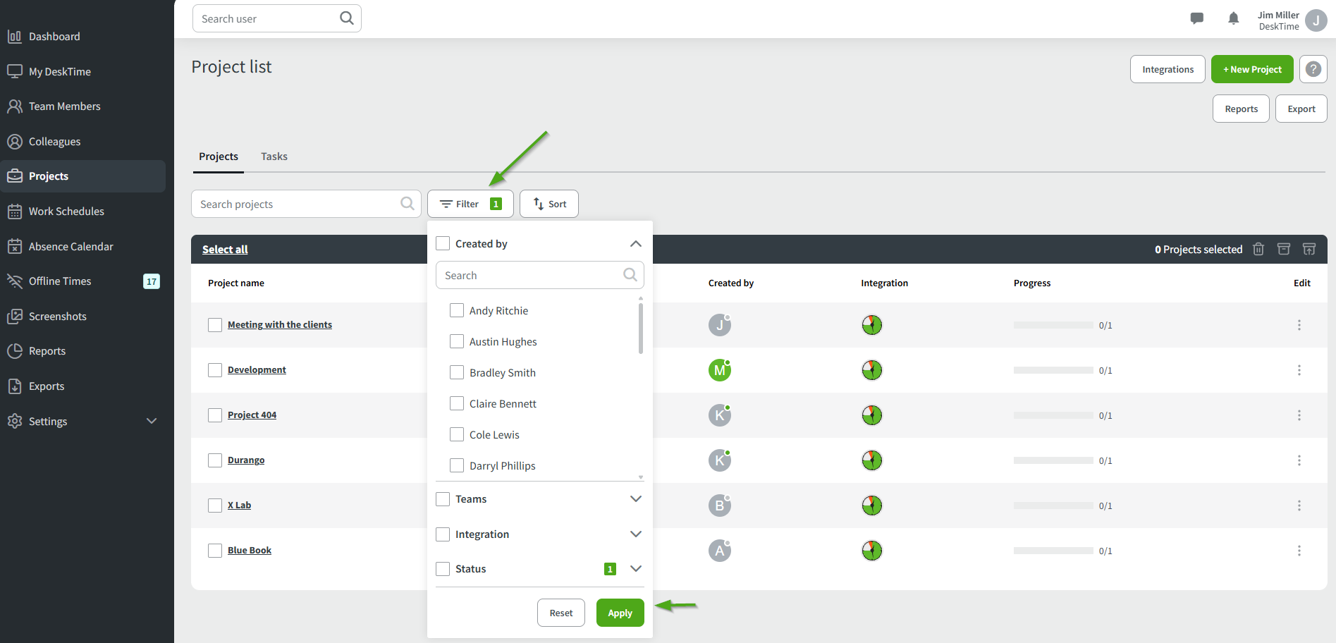 - Created by – sorts projects by the user who created them.