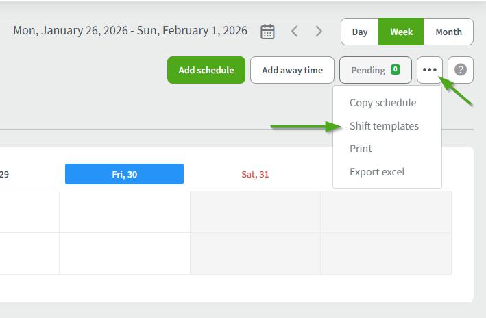 To create a shift template, click on the three horizontal dots in the upper-right part of the Work schedules section. Select Shift templates from the menu.