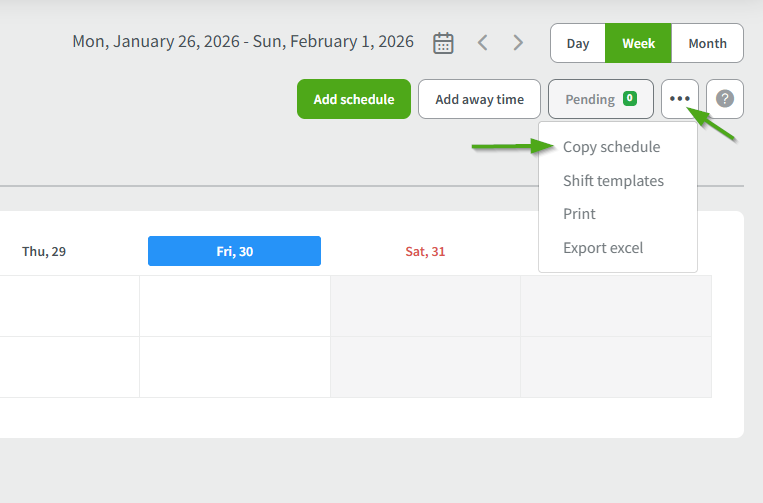 For example, if you view the first week of January, pressing the Copy schedule option will copy all of the schedules from that week over to the second week of January.