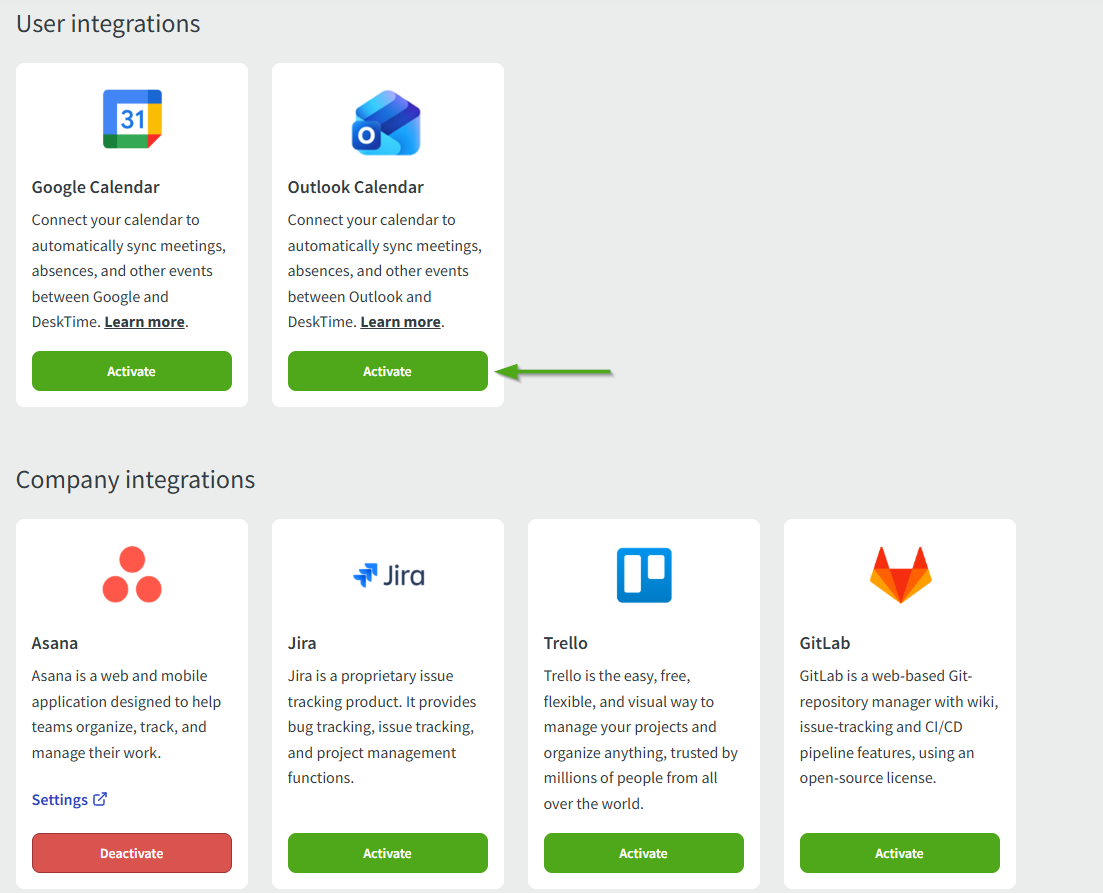 The integrations are available for the Company Admins and the Owner, and only 1 account of each project management tool can be integrated with the DeskTime account.