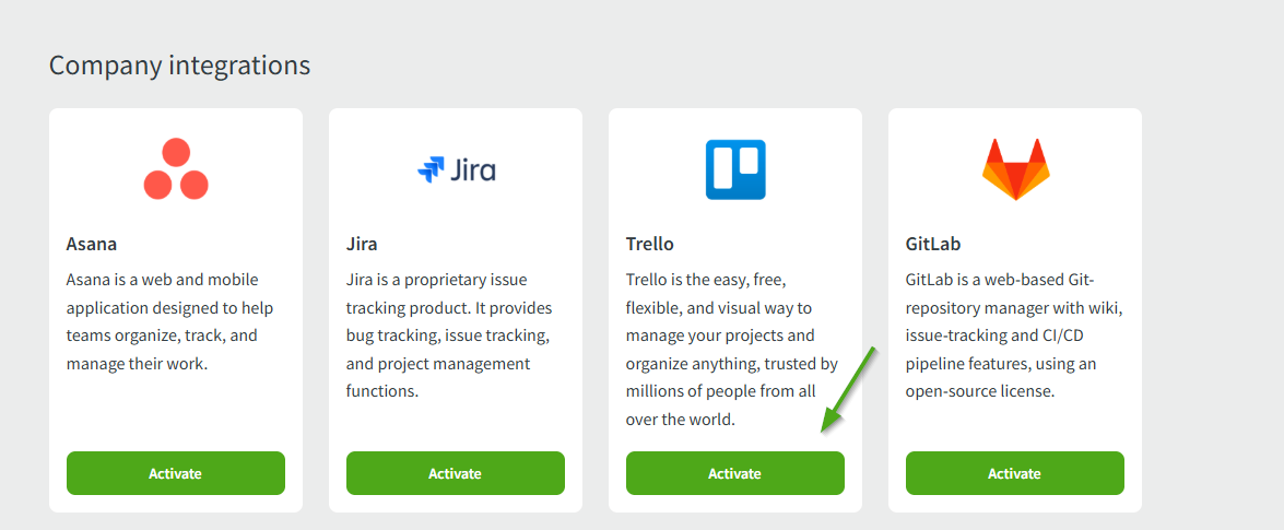 2. Find the Trello integration under Company integrations in the second row and press Activate: