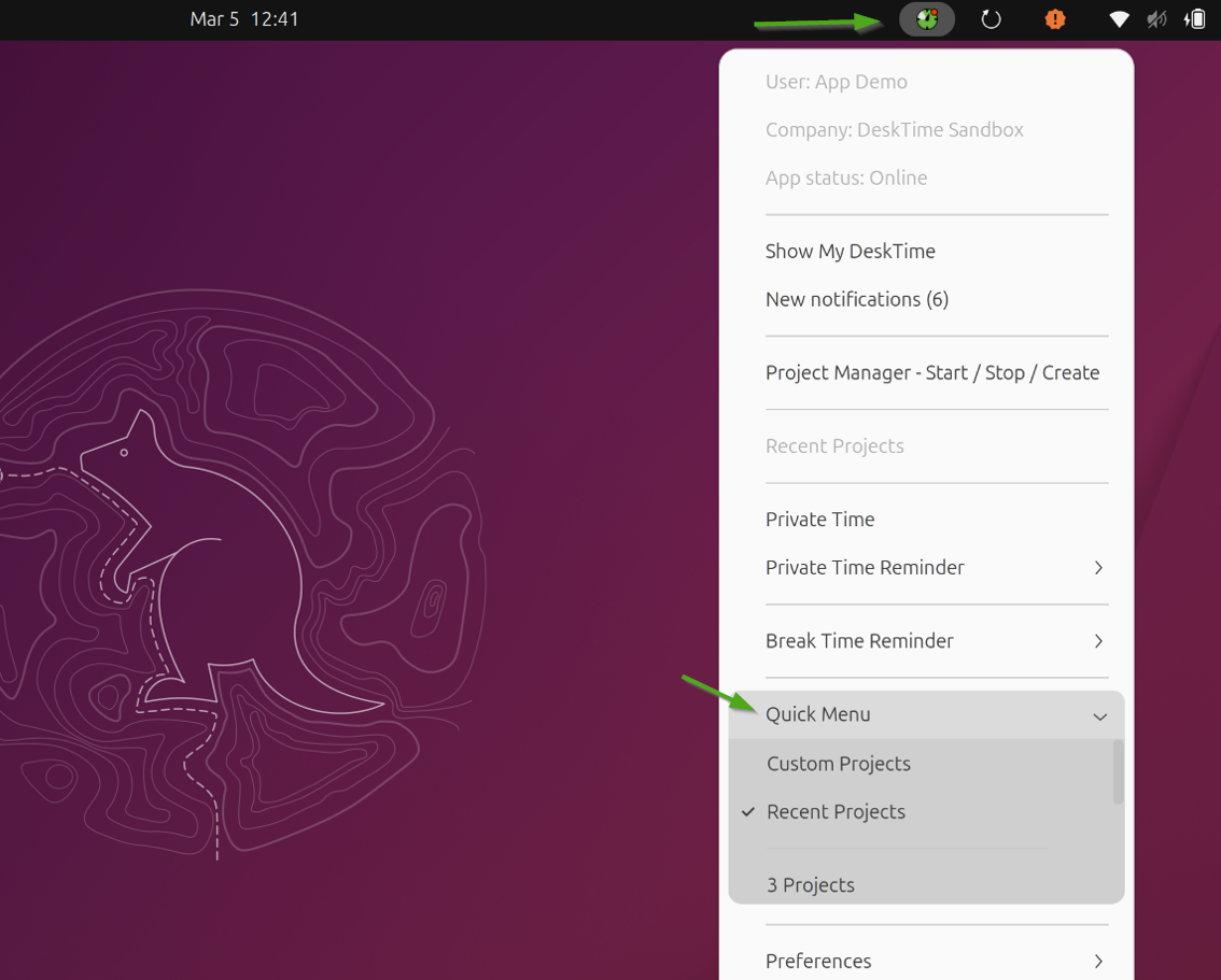 The Recent Projects option displays a list of the projects and tasks you've tracked recently. This feature provides a convenient way to revisit or switch between recent work. Additionally, you can customize the number of projects shown in the list according to your preference.