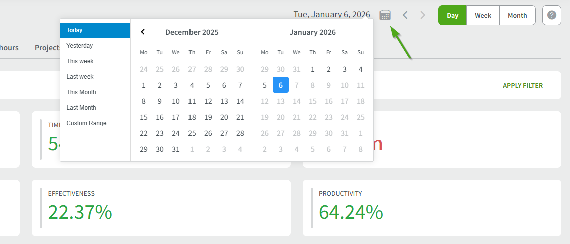 - If you need to choose a different time period than the default day/week or month, you must click on the calendar icon where you can select a custom period.