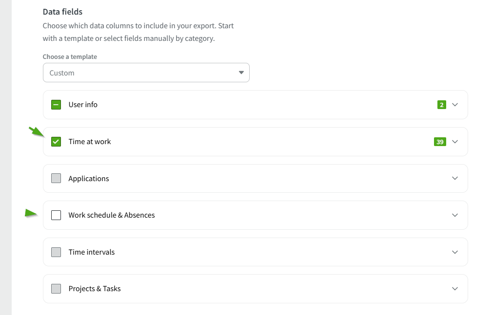 NOTE! that combining different export times is currently not possible, with the exception being Time at work + Work schedule & Absences export types.