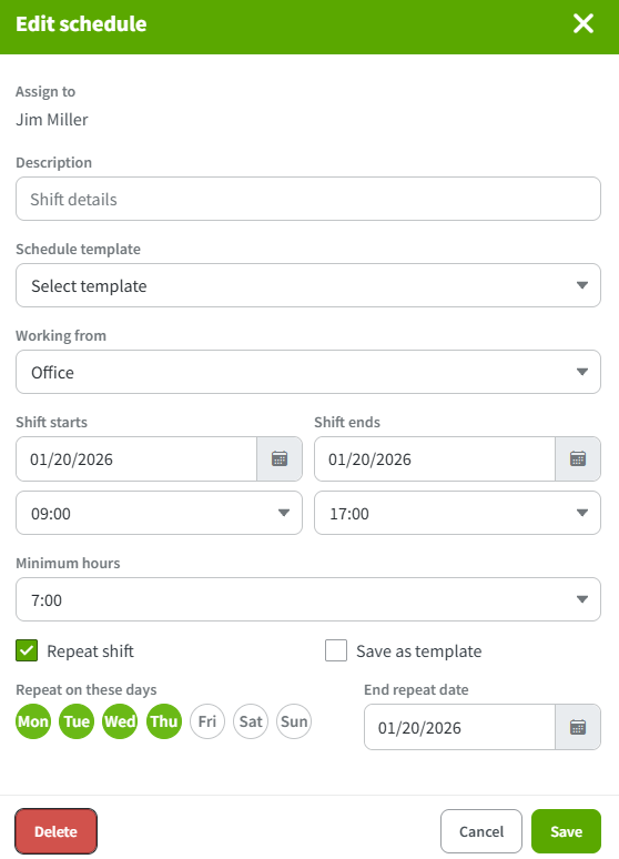 This will open a window identical to the window for creating a shift, but with the current shift's details entered. Change the required details here and click SAVE.