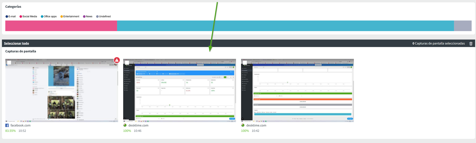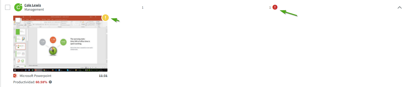 Aquí verá las capturas de pantalla del día de cada usuario. El número de la derecha que aparece junto al nombre del usuario muestra el número de capturas de pantalla que se han realizado ese día, y el número de la izquierda muestra el número de esas capturas que son improductivas o sospechosas.