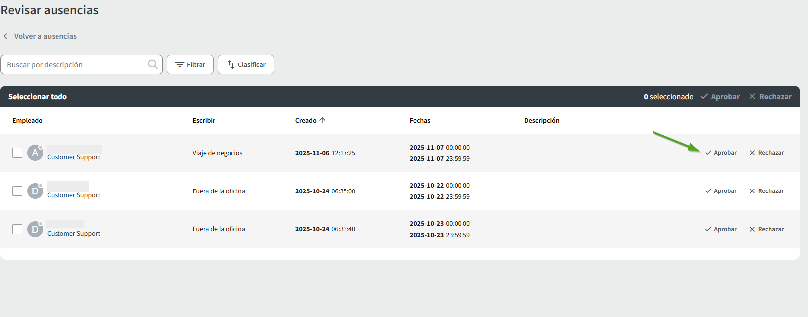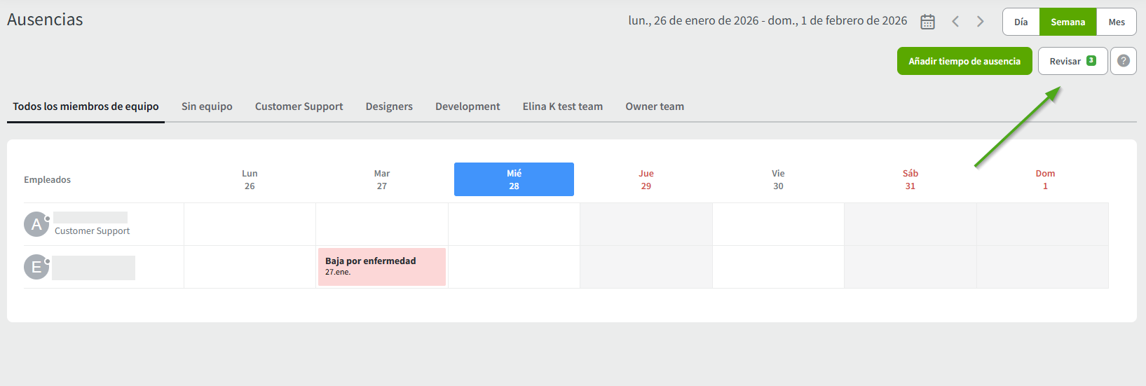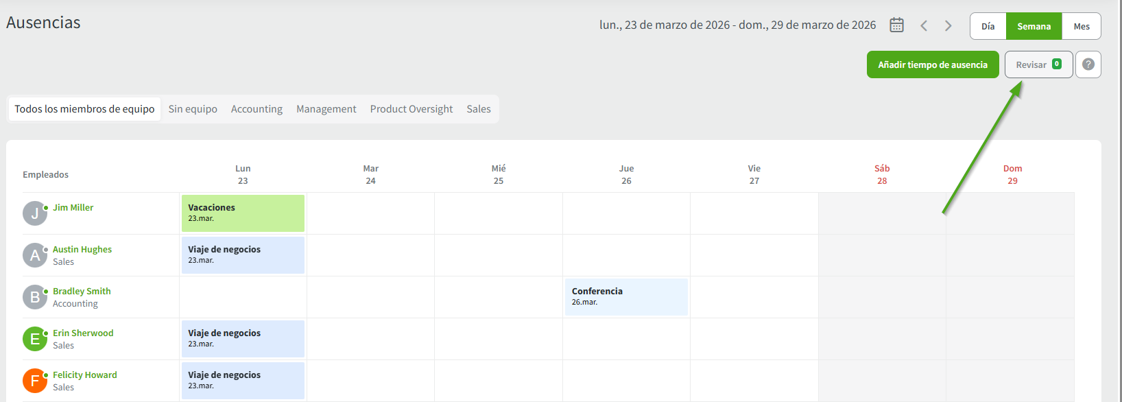 Si un usuario agrega una ausencia a través del calendario de Ausencia, antes de que el Tiempo de Ausencia sea agregado a su horario, el propietario de la cuenta o un administrador tiene que aprobar la ausencia. Para aprobar la ausencia, ve al Calendario de Ausencias → Revisar.