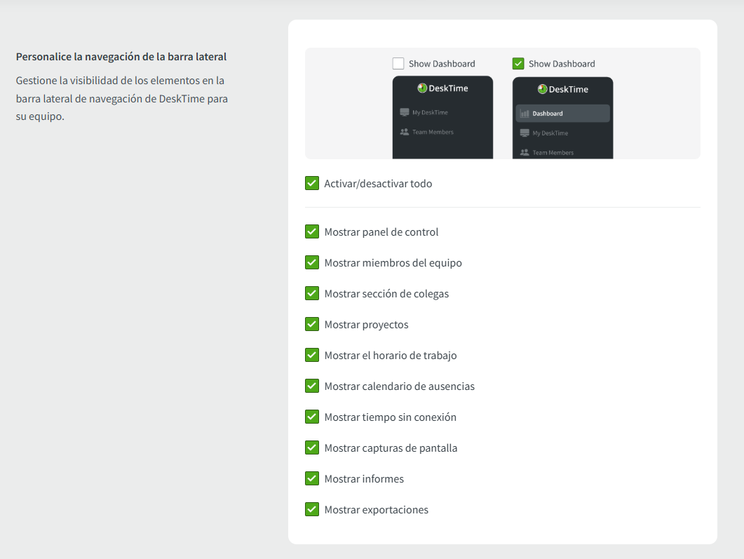 Si desea que los miembros de su equipo puedan ver la sección Calendario de ausencias, asegúrese de que en Configuración → Cuenta → Personalización de la barra lateral, la casilla Mostrar calendario de ausencias esté marcada.