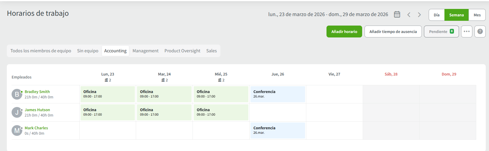 Todas las ausencias aprobadas en el calendario de Ausencias serán visibles en la sección Horarios de trabajo.