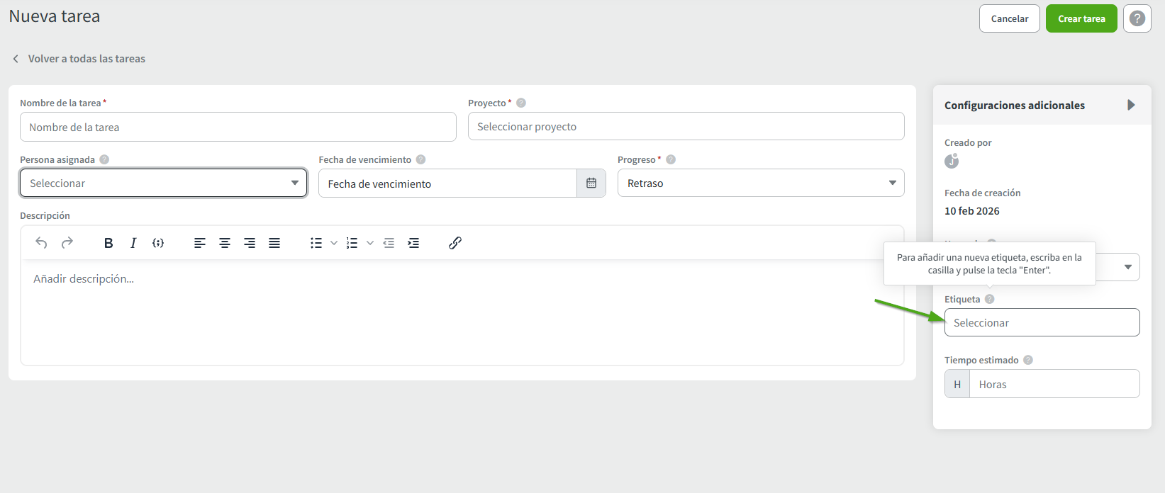Aplique etiquetas a las tareas para clasificarlas e identificar tareas similares fácilmente. Escriba cualquier etiqueta nueva en el cuadro de texto y pulse Intro.