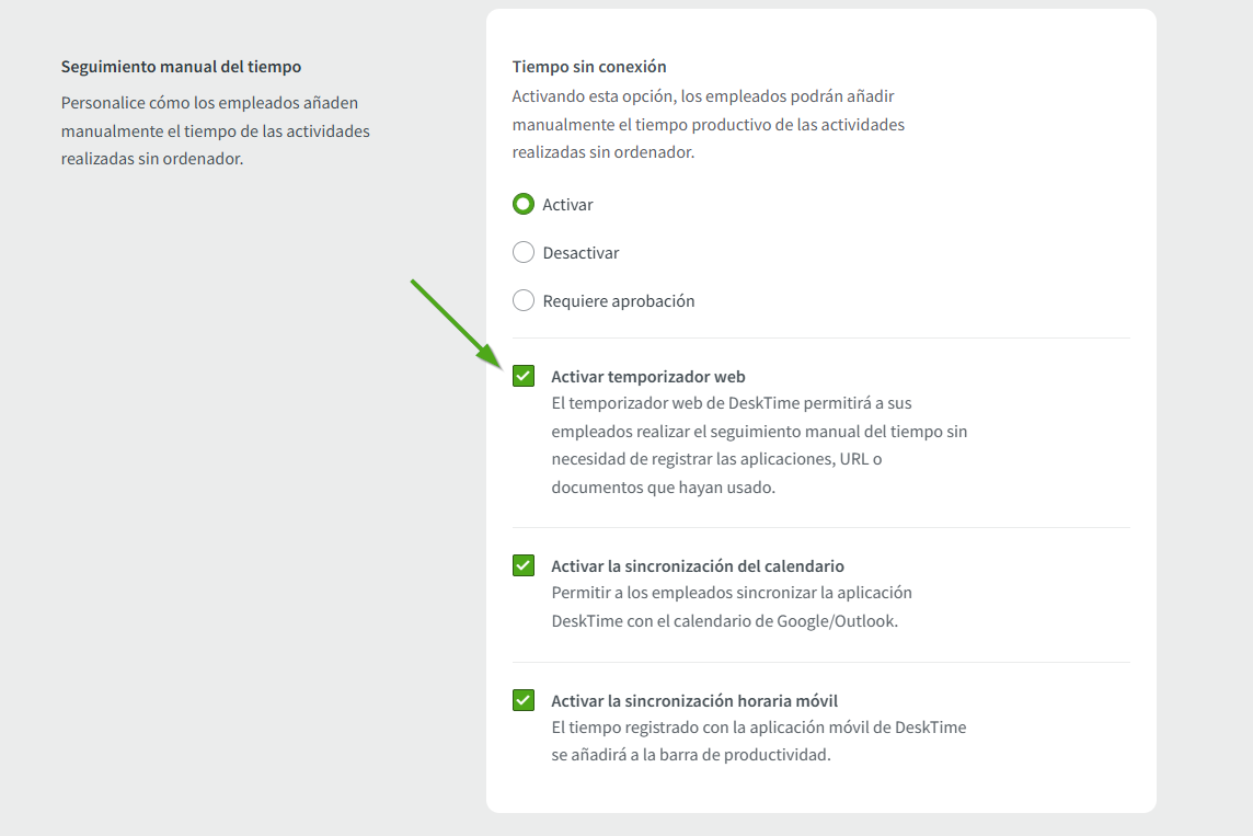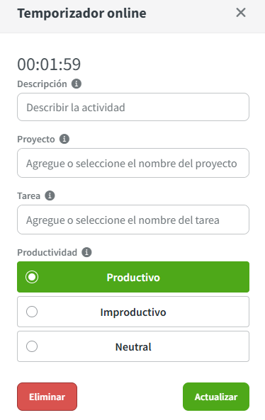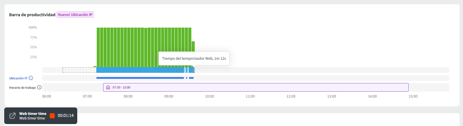 Prioridad de datos: si ambos están funcionando, la aplicación de escritorio (seguimiento automático) es la fuente de datos principal para el uso de la aplicación y las URL. El temporizador web simplemente rellenará los huecos de inactividad en los que la aplicación de escritorio no haya detectado actividad.